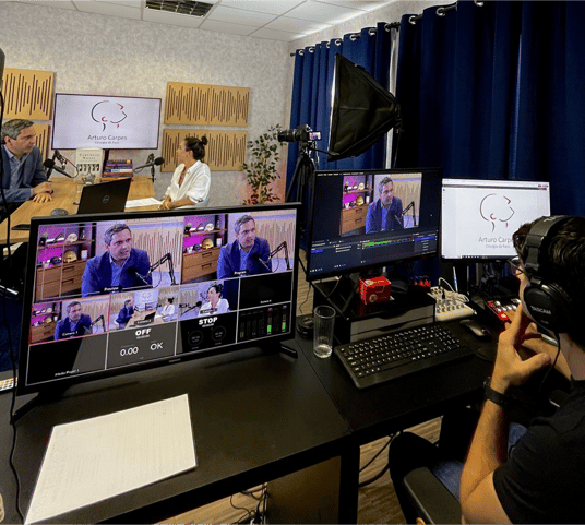 Produzimos seu podcast com gravação ou transmissão ao vivo, com cenário personalizável em estúdio próprio